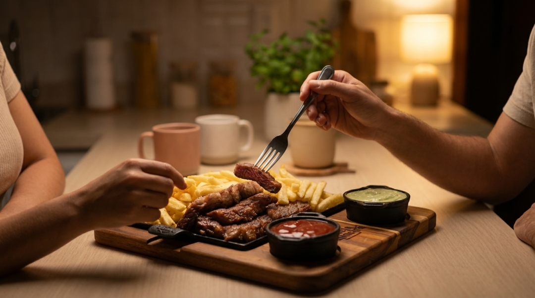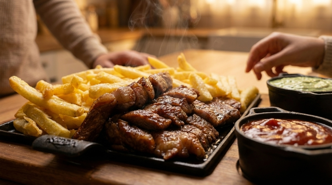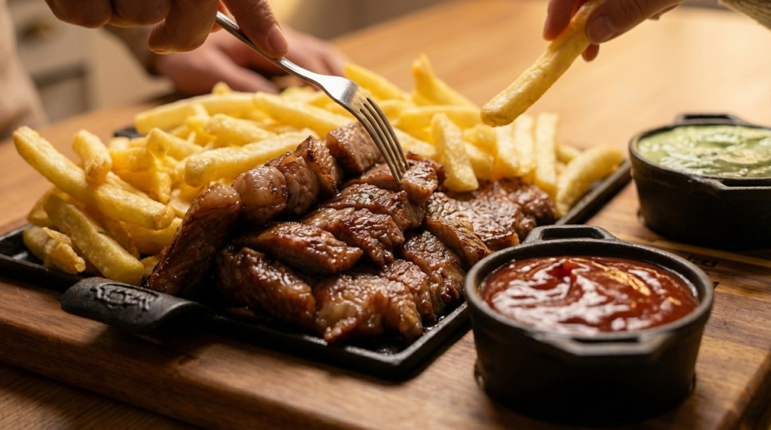 Uma porção que dá água na boca🤤! Picanha temperada e assada no ponto certo somada à crocância da batata frita sequinha é uma combinação que nós queremos te proporcionar hoje. São: